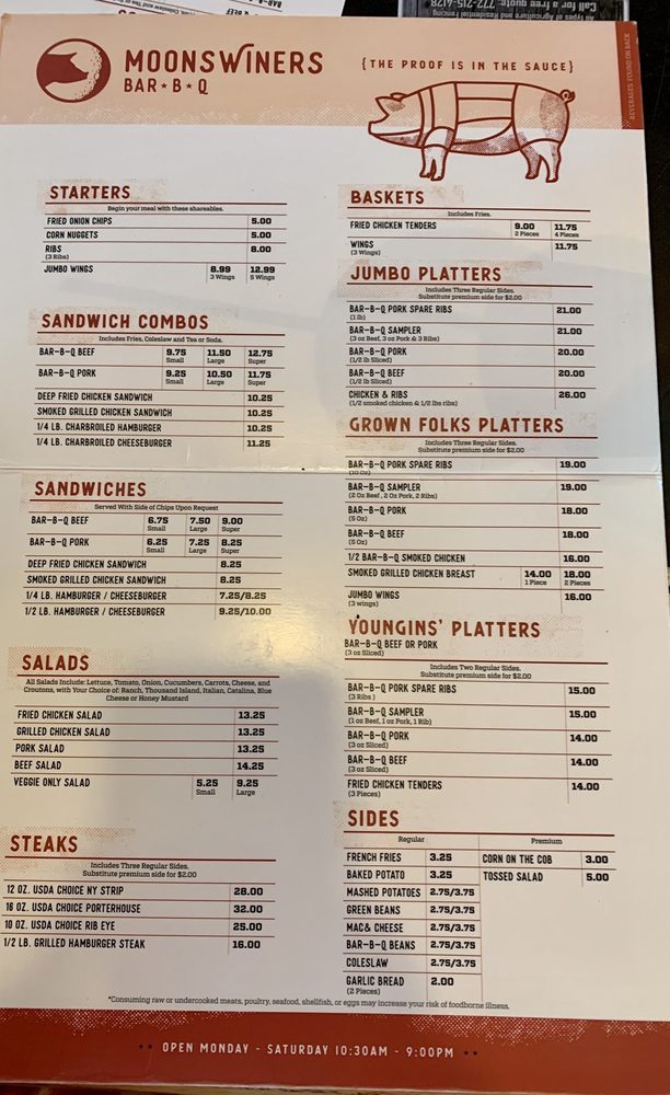 The lunch special provides great value, featuring a sandwich, coleslaw, fries, and a drink for just $10. Diners can also enjoy the friendly service and the option to dine outdoors. With offerings like drive-thru, catering, and payment flexibility including Apple Pay, Moonswiners ensures convenience without sacrificing flavor. Whether you're in for lunch or dinner, the bottomless sweet tea and a carefully selected array of sauces will enhance your experience. Don’t miss out on this local gem!